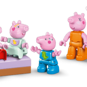 Toddlers play out routines alongside their favorite TV characters with the Peppa Pig Family House (10467) building kit. This toddler gift for girls and boys ages 2 and up includes the full family of 5 Peppa Pig characters including Evie Pig. Like in the show, this 2-level LEGO® DUPLO® toy house has separate rooms for George and Peppa Pig, a kitchen, bathroom and lounge. This pretend play toy encourages young girls and boys to recreate scenes from the show and routines from their own home, suchas getting ready for bed, or having a family breakfast. With this building set’s 5 LEGO DUPLO figures – Mummy Pig, Daddy Pig, George, Evie and Peppa Pig – kids can grow their emotional intelligence as they imagine having a new family member. Packedwith accessories for imaginative play, this toddler learning toy lets little builders imagine caring for the baby by taking her for a walk in the stroller, feeding her with the bottle or giving her a bath. Contains 84 pieces.