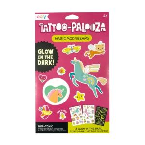 Make playtime magical with the Tattoo-Palooza Glow in the Dark Temporary Tattoos – Magic Moonbeams! This set of 3 tattoo sheets features temporary tattoos with whimsical designs like unicorns, stars, and crescent moons that glow in the dark.