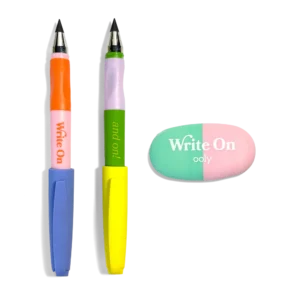 Ready, set, sketch! The Write On Graphite Pencil Set gives a sleek upgrade to your standard pencil pack. Made of solid graphite from tip to tail, these pencils last longer, sharpen cleaner, and deliver a satisfyingly smooth writing experience. With two bold, woodless graphite pencils and one colorful eraser, this 3-piece set is made for big thinkers, tiny doodlers, and everyone in between.